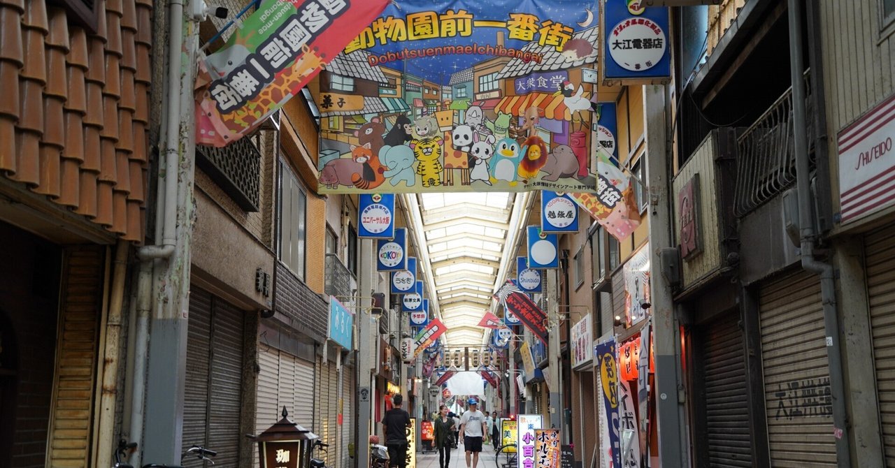 今回お伝えするのは、そんな釜ヶ崎エリアに隣接する「西成区太子・山王」の町内を南北に貫き、地下鉄御堂筋線動物園前駅を挟んでジャンジャン横丁から連なり飛田新地へと至るメインストリート「飛田本通商店街」の過去の風景と、それからごく最近の様子である。愛称として「動物園前一番街・二番街」の名称もあり、アーケードの入口の看板にはそう記されてもいるが、ここの正式名称はあくまで「飛田本通」である。